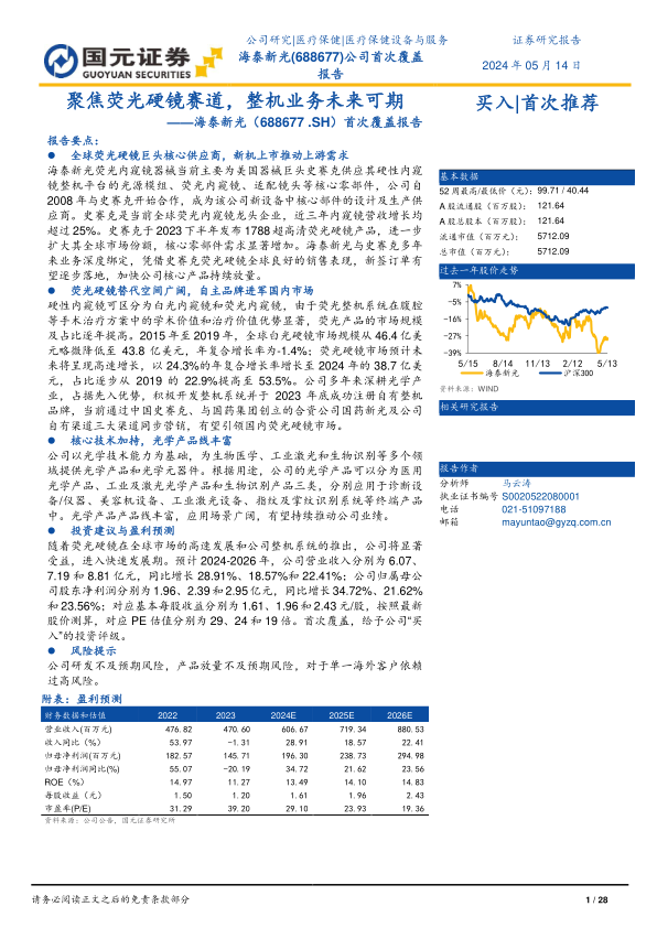选取可比公司开立医疗、澳华内镜和迈瑞医疗进行估值对比,2024年平均PE为40倍。根据海泰新光的盈利预测,其2024-2026年对应PE估值分别为29倍、24倍和19倍。鉴于公司在荧光硬镜领域的领先地位和未来增长潜力,首次覆盖给予公司“买入”的投资评级。