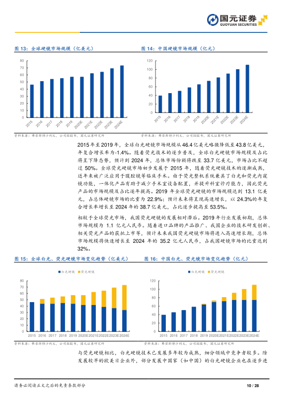 全球硬镜市场趋于成熟,2019年市场规模达56.9亿美元,预计到2024年将以4.9%的年复合增长率增长至72.3亿美元。相比之下,中国硬镜市场仍处于高速发展阶段,2019年市场规模为65.3亿元人民币,预计到2024年将以11%的年复合增长率增长至110亿元人民币。