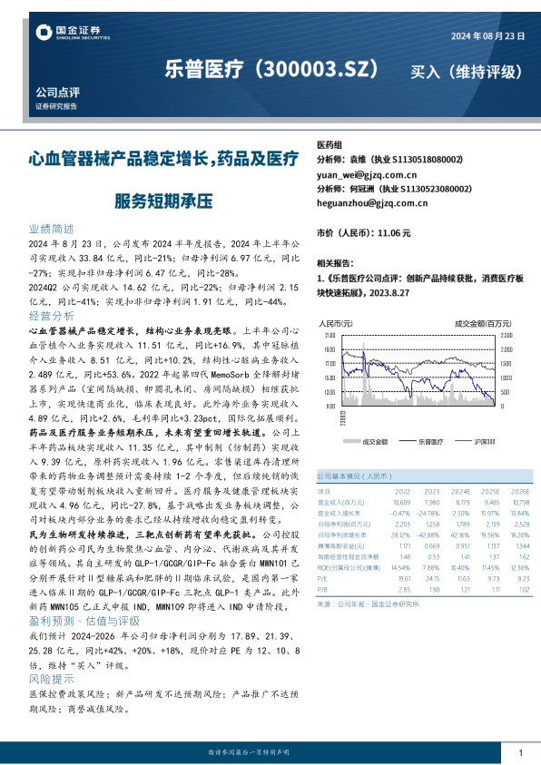 乐普医疗2024年上半年业绩受到药品和医疗服务业务的拖累,整体营收和利润出现下滑。但心血管器械业务表现稳健,结构心业务增长迅速,创新药研发也取得积极进展。预计随着药品业务的调整完成和创新药的逐步上市,公司未来有望重回增长轨道。维持“买入”评级,但需关注医保政策、研发进度和市场推广等风险因素。