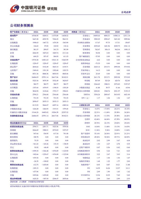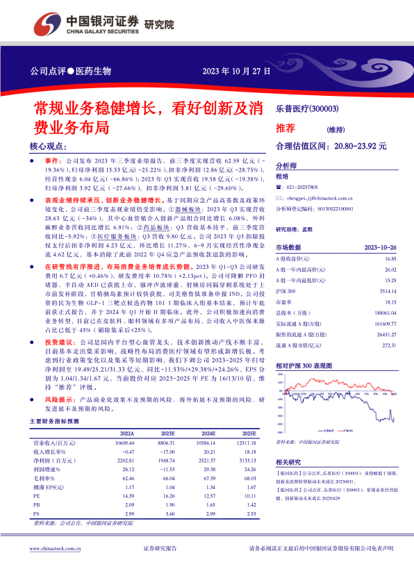 中国银河证券认为乐普医疗作为国内平台型心血管龙头,技术创新推动产线不断丰富,目前已基本走出集采影响,战略性布局消费医疗领域有望形成新增长极。考虑到行业政策变化以及集采等短期影响,下调公司2023-2025年归母净利润预测至19.49/25.21/31.33亿元,同比增速分别为-11.53%/+29.38%/+24.26%,对应EPS分别为1.04/1.34/1.67元。当前股价对应2023-2025年PE为16/13/10倍,维持“推荐”评级。