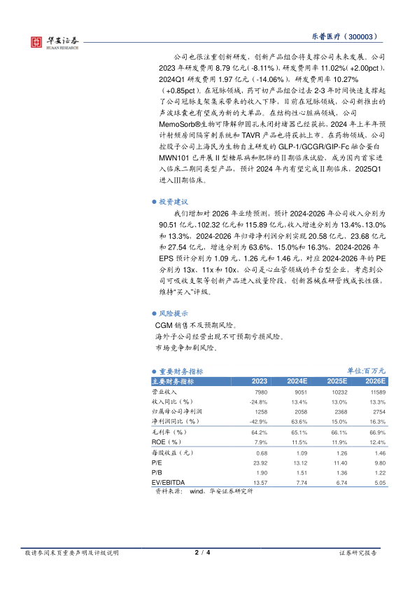 我们增加对2026年业绩预测,预计2024-2026年公司收入分别为90.51亿元、102.32亿元和115.89亿元,收入增速分别为13.4%、13.0%和13.3%,2024-2026年归母净利润分别实现20.58亿元、23.68亿元和27.54亿元,增速分别为63.6%、15.0%和16.3%,2024-2026年EPS预计分别为1.09元、1.26元和1.46元,对应2024-2026年的PE分别为13x、11x和10x,公司是心血管领域的平台型企业,考虑到公司可吸收支架等创新产品进入放量阶段,创新器械在研管线成长性强,维持“买入”评级。