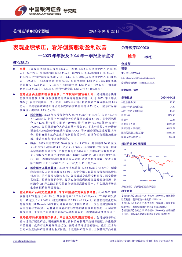 乐普医疗2023年及2024年一季度业绩受应急业务高基数和资产减值计提影响,呈现表观承压态势。然而,公司在医疗器械、药品、医疗服务及健康管理三大核心业务板块展现出结构性增长和发展韧性。通过持续的研发投入,多款创新产品获批并拥有丰富的在研管线,为未来业绩增长提供动力。同时,公司战略性布局消费医疗领域,并积极拓展国内外销售渠道,强化协同效应,以应对政策扰动并开拓新的增长极。尽管分析师下调了短期盈利预测,但基于创新驱动和战略转型的积极进展,仍维持“推荐”评级,看好公司长期发展潜力。