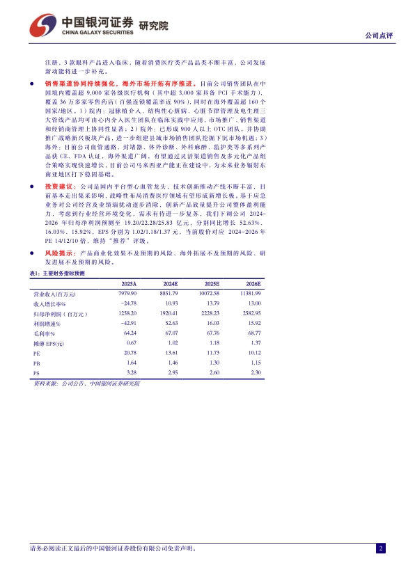 投资建议:公司是国内平台型心血管龙头,技术创新推动产线不断丰富,目前基本走出集采影响,战略性布局消费医疗领域有望形成新增长极。基于应急业务对公司经营及业绩端扰动逐步消除,创新产品放量提升公司整体盈利能力,考虑到行业经营环境变化,需求有待进一步复苏,我们下调公司2024-2026年归母净利润预测至19.20/22.28/25.83亿元,分别同比增长52.63%、16.03%、15.92%,EPS分别为1.02/1.18/1.37元,当前股价对应2024-2026年PE14/12/10倍,维持“推荐”评级。