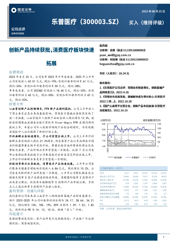 我们看好公司未来在心血管介入领域创新器械产品的发展潜力,预计2023-2025年公司归母净利润分别为24.17、28.64、34.21亿元,同比增长10%、18%、19%,EPS分别为1.29、1.52、1.82元,现价对应PE为14、12、10倍,维持“买入”评级。