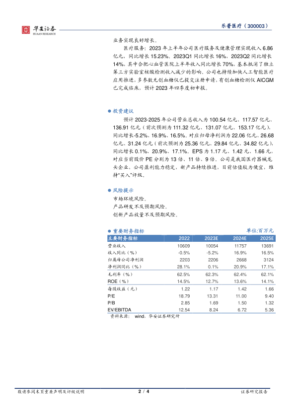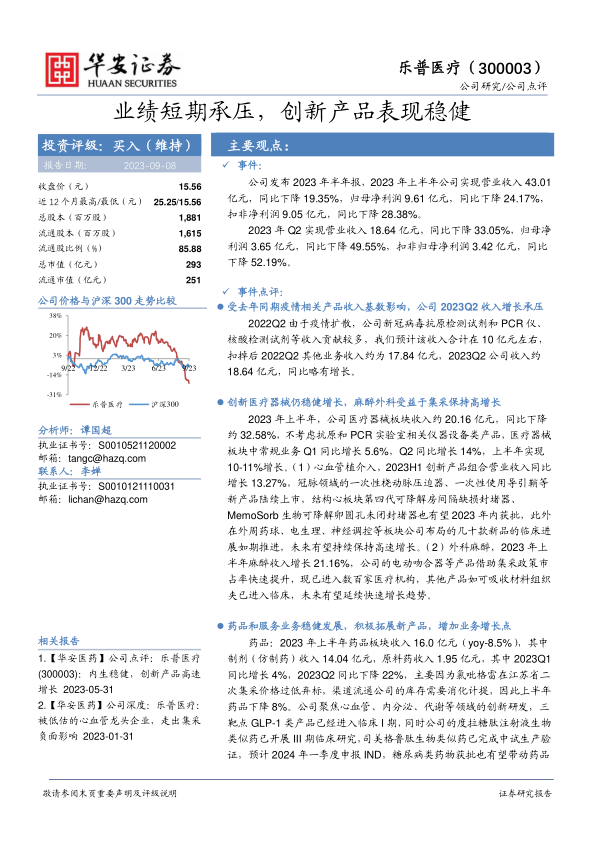 本报告分析了乐普医疗2023年半年度业绩,指出公司业绩短期承压,但创新产品表现稳健。