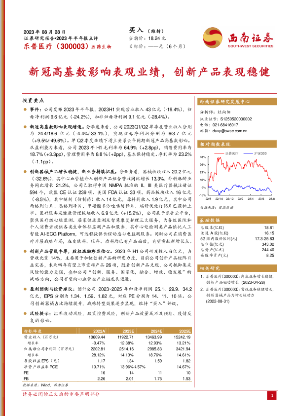 乐普医疗2023年半年报显示,公司业绩受到新冠高基数的影响,但创新业务表现稳健,创新产品管线丰富,未来增长可期。公司战略转型效果逐步显现,维持“买入”评级。投资者应关注汇率波动风险、政策控费风险、创新产品放量或不及预期、疫情反复的影响等风险因素。