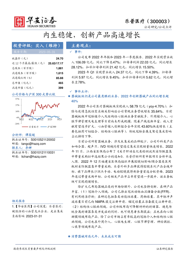 本报告对乐普医疗2022年年报和2023年一季度报告进行了分析,核心观点如下: