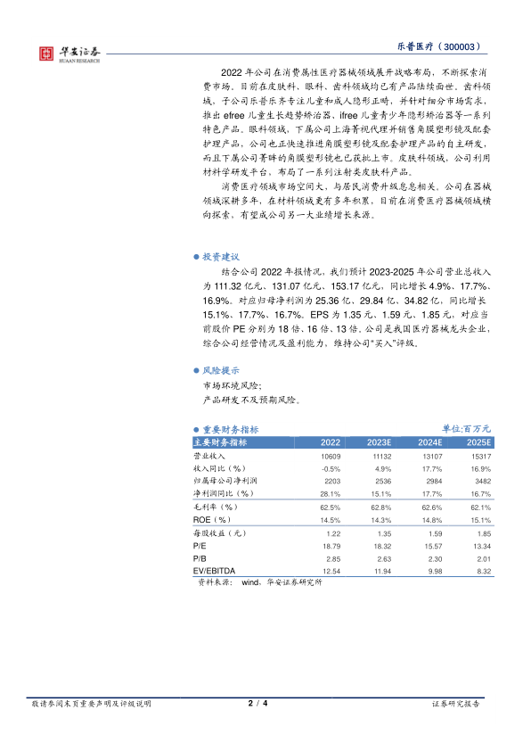 结合公司2022年报情况,我们预计2023-2025年公司营业总收入为111.32亿元、131.07亿元、153.17亿元,同比增长4.9%、17.7%、16.9%。对应归母净利润为25.36亿、29.84亿、34.82亿,同比增长15.1%、17.7%、16.7%。EPS为1.35元、1.59元、1.85元,对应当前股价PE分别为18倍、16倍、13倍。公司是我国医疗器械龙头企业,综合公司经营情况及盈利能力,维持公司“买入”评级。
