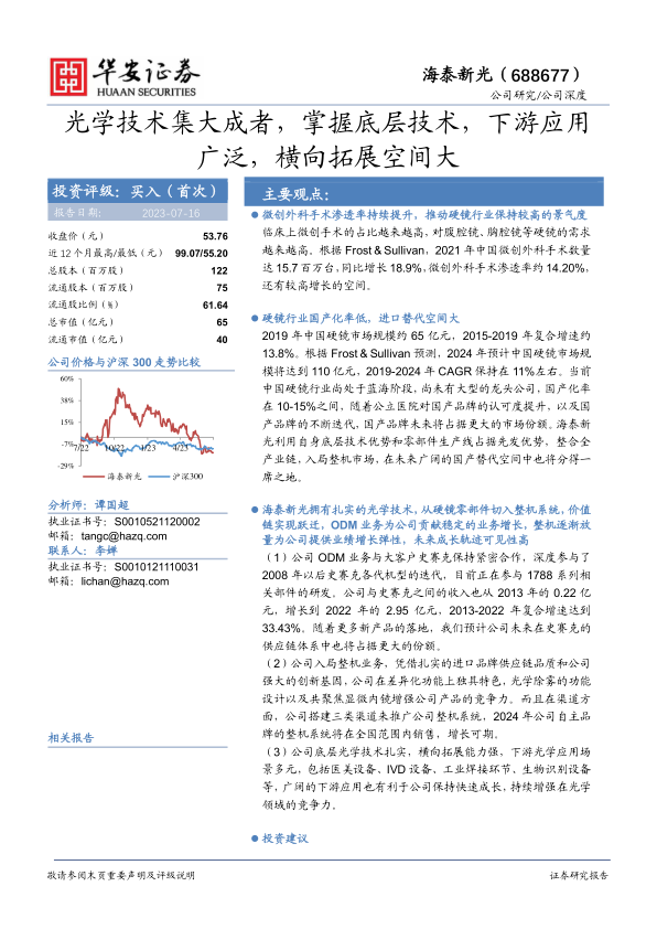 我们预计公司2023-2025年收入端有望分别实现6.57亿元、8.91亿元、11.56亿元,收入同比增速分别为37.8%、35.6%和29.7%,归母净利润预计2023-2025年分别实现2.27亿元、3.27亿元和4.24亿元,利润同比增速分别为24.5%、43.9%和29.7%。2023-2025年对应的EPS分别约1.87元、2.69元和3.49元,对应的PE估值分别为29倍、20倍和15倍,考虑到公司硬镜产品行业领先,在光学技术积累深厚,从零部件进军整机系统,未来在国产替代浪潮中有望取得一定市场份额,首次覆盖,买入评级。