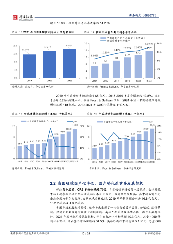 2019年中国硬镜市场规模约65亿元,2015-2019年复合增速约13.8%。根据Frost&Sullivan预测,2024年预计中国硬镜市场规模将达到110亿元,2019-2024年CAGR保持在11%左右。当前中国硬镜行业尚处于蓝海阶段,尚未有大型的龙头公司,国产化率在10-15%之间,随着公立医院对国产品牌的认可度提升,以及国产品牌的不断迭代,国产品牌未来将占据更大的市场份额。海泰新光利用自身底层技术优势和零部件生产线占据先发优势,整合全产业链,入局整机市场,在未来广阔的国产替代空间中也将分得一席之地。
