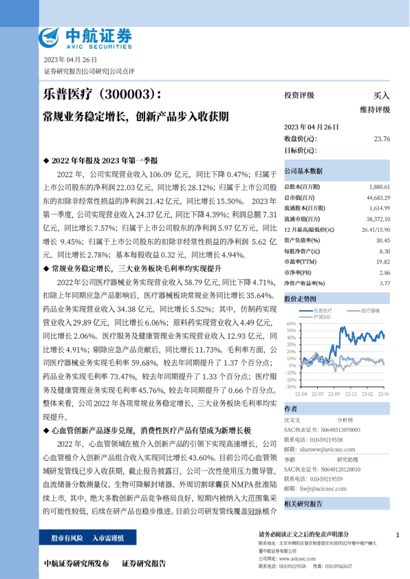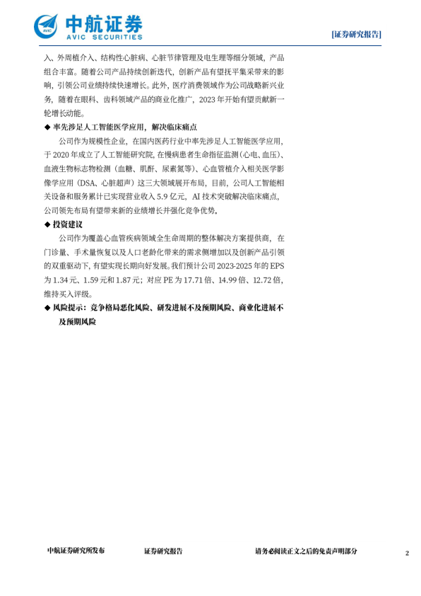 公司作为覆盖心血管疾病领域全生命周期的整体解决方案提供商,在门诊量、手术量恢复以及人口老龄化带来的需求侧增加以及创新产品引领的双重驱动下,有望实现长期向好发展。我们预计公司2023-2025年的EPS为1.34元、1.59元和1.87元;对应PE为17.71倍、14.99倍、12.72倍,维持买入评级。