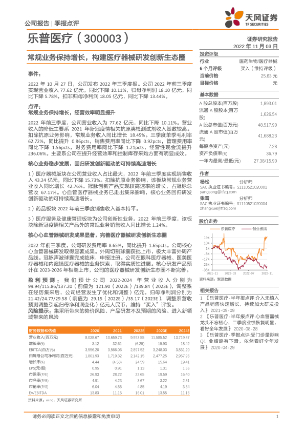 本报告对乐普医疗(300003)2022年三季度报进行了分析,核心观点如下: