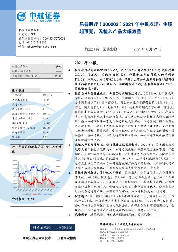 乐普医疗2021年中报显示,公司业绩大幅超出预期,主要得益于以下几个方面: