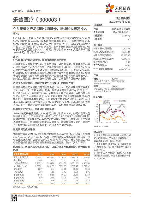 本报告对乐普医疗2021年半年报进行了深入分析,核心观点如下: