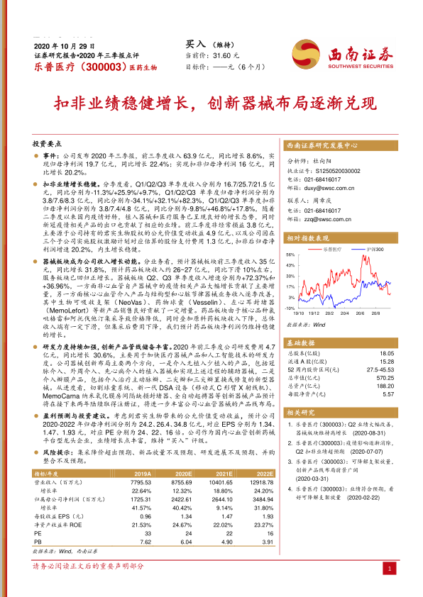 乐普医疗2020年三季报显示,公司扣非业绩稳健增长,创新器械布局逐渐兑现,器械板块成为收入增长的主要驱动力。公司持续加强研发投入,创新产品管线储备丰富。报告预计公司未来几年业绩将保持增长,维持“买入”评级,但同时也提示了集采降价、新品放量、研发进展和并购整合等风险。