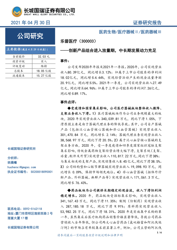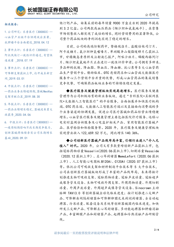 乐普医疗在2020年及2021年一季度展现出稳健的财务表现,尤其在2021年一季度实现了营收和净利润的大幅增长。面对国家集采对传统医疗器械(特别是冠脉支架)和药品业务带来的挑战,公司通过积极的战略调整和创新驱动,成功实现了业务结构的优化。其“介入无植入”创新产品组合(如可降解支架、药物球囊等)已进入快速放量期,成为新的业绩增长引擎,并在2021年一季度贡献了显著的销售收入增长。同时,非心血管器械和医疗服务及健康管理板块也保持高速增长。药品板块虽受集采影响收入下滑,但通过市场份额提升和费用控制实现了利润稳定。公司丰富的创新医疗器械研发管线和“预研一代、注册一代、生产销售一代”的策略,为其中长期发展提供了充足动力。尽管存在市场拓展和研发进度不及预期以及集采风险,但公司凭借其创新能力和多元化布局,预计未来盈利能力将持续提升,维持“买入”投资评级。