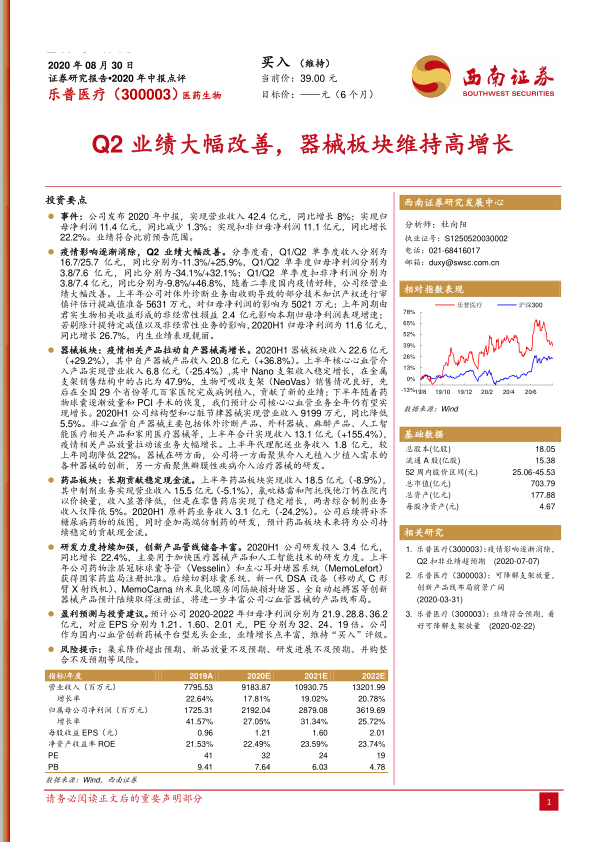 乐普医疗2020年中报显示,公司Q2业绩大幅改善,器械板块维持高增长,疫情相关产品拉动自产器械收入大幅增长。公司药品板块长期贡献稳定现金流。公司研发力度持续加强,创新产品管线储备丰富,多个创新器械产品预计陆续取得注册证。维持“买入”评级,看好公司作为国内心血管创新药械平台型龙头企业的未来发展。