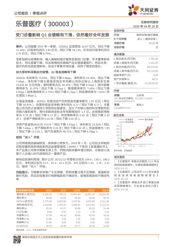 本报告对乐普医疗(300003)2020年一季报进行了分析,核心观点如下: