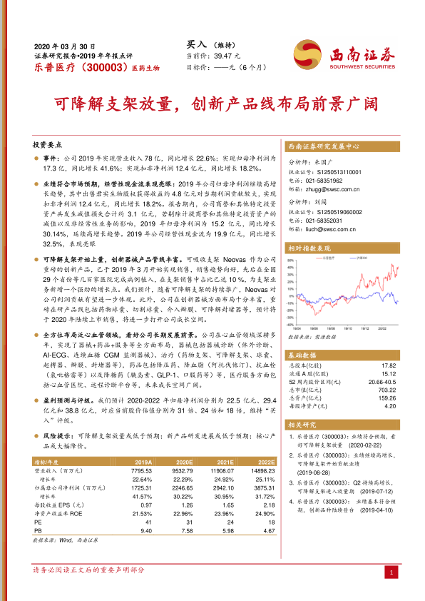 本报告分析了乐普医疗2019年年报,指出公司业绩符合预期,可降解支架开始放量,创新产品线布局前景广阔。公司在心血管领域进行全方位布局,长期发展前景看好。维持“买入”评级,但需关注可降解支架放量不及预期、新产品研发进展不及预期以及核心产品大幅降价的风险。
