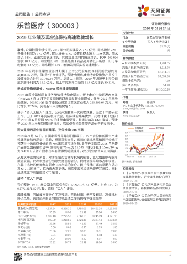 本报告分析了乐普医疗2019年的业绩表现,指出公司在器械和药品两大板块均有亮点。器械方面,NeoVas等新产品带来增长动力;药品方面,国家集采有望提升市场份额。维持“买入”评级,但同时也提示了相关风险。