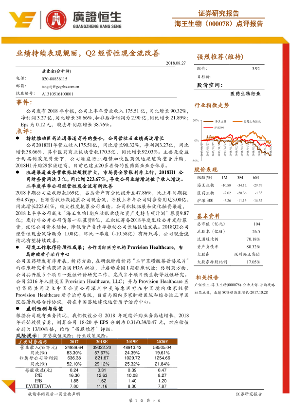 海王生物2018年上半年通过积极的医药流通渠道商并购整合,实现了营业收入和净利润的高速增长。公司在“两票制”政策背景下,迅速扩大了医药商业板块的市场份额,并建立了覆盖多省份的业务体系。同时,公司在创新药研发和高端医疗服务(如肿瘤质子治疗中心)方面也取得了阶段性进展,展现了多元化的战略布局。
