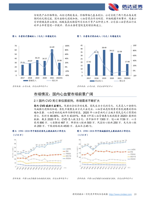 中国心血管疾病(CVD)对居民健康的威胁日益增大。根据《中国心血管健康与疾病报告2020》数据,截至2020年末,中国CVD患病人数高达3.3亿,其中高血压2.45亿、脑卒中1300万、冠心病1139万。2020年,心血管病死亡占城乡居民总死亡原因的首位,农村为46.66%,城市为43.81%。国内CVD死亡率位居前列,市场需求持续扩大。