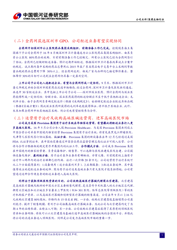 公司成为美国Provision集团质子治疗系统在华独家运营商,有望藉此将配送业务打入更多高端大医院。公司入股Provision Healthcare,共同设立中国合资公司并在中国境内独家经营Provision集团质子治疗系统。公司收购高端医疗器械代理商北京建昌,该公司是达芬奇手术机器人的北方地区总代理,拥有北京地区和北方地区多家著名三甲医院的医疗机构客户资源。收购北京建昌能直接增厚公司盈利能力、提升销售规模,并获得其原有的顶级医院资源和业务网络,为公司发力高端医院市场奠定基础。