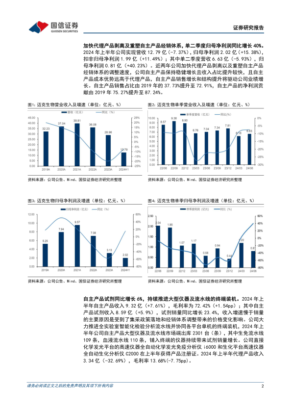 本报告对迈克生物(300463.SZ)2024年半年度业绩进行了分析,并维持“优于大市”评级。核心观点如下: