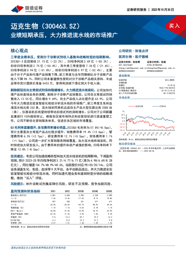 迈克生物在2023年前三季度面临业绩短期承压,营收和净利润均出现显著下滑,主要原因在于分子诊断产品收入基数高和公司战略转型带来的阵痛,特别是分子诊断产品销售大幅下降及相关存货跌价准备的计提。然而,公司在剔除新冠相关业务后,自主常规试剂销售保持稳健增长,自主产品收入占比提升。同时,公司正积极推进实验室智能化检验分析流水线的市场推广,通过大量仪器装机以带动后续试剂消耗,并优化营销服务体系以扩大市场覆盖。尽管第三季度毛利率有所提升,但各项费用率的增长和资产减值导致净利率下降。分析师下调了未来三年的盈利预测,但鉴于公司在多平台业务布局、新品研发及全实验室智能化流水线战略上的积极推进,仍维持“买入”评级,并提示了集采降价、研发不及预期和竞争加剧等风险。
