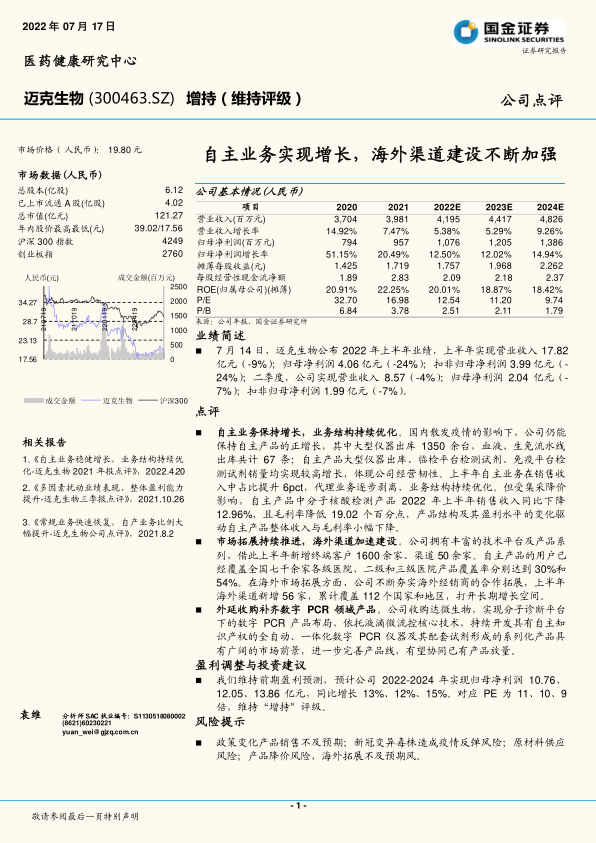 迈克生物自主业务稳健增长,业务结构持续优化,海外渠道加速建设,并通过外延收购补齐产品线。但同时也面临政策变化、疫情反弹、原材料供应、产品降价以及海外拓展不及预期等风险。
