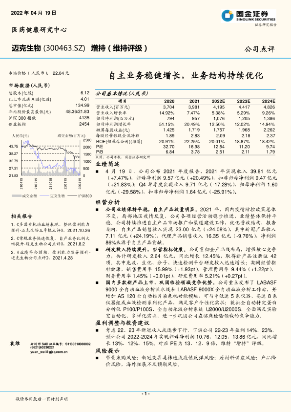 本报告分析了迈克生物2021年的业绩表现和经营情况,指出公司自主业务稳健增长,研发投入持续提升,并在临床检验领域不断巩固竞争优势。虽然考虑到新冠相关收入可能下降,下调了公司未来两年的盈利预测,但维持“增持”评级。同时,报告也提示了带量采购、疫情反弹、原材料供应、产品降价以及海外拓展等风险因素。