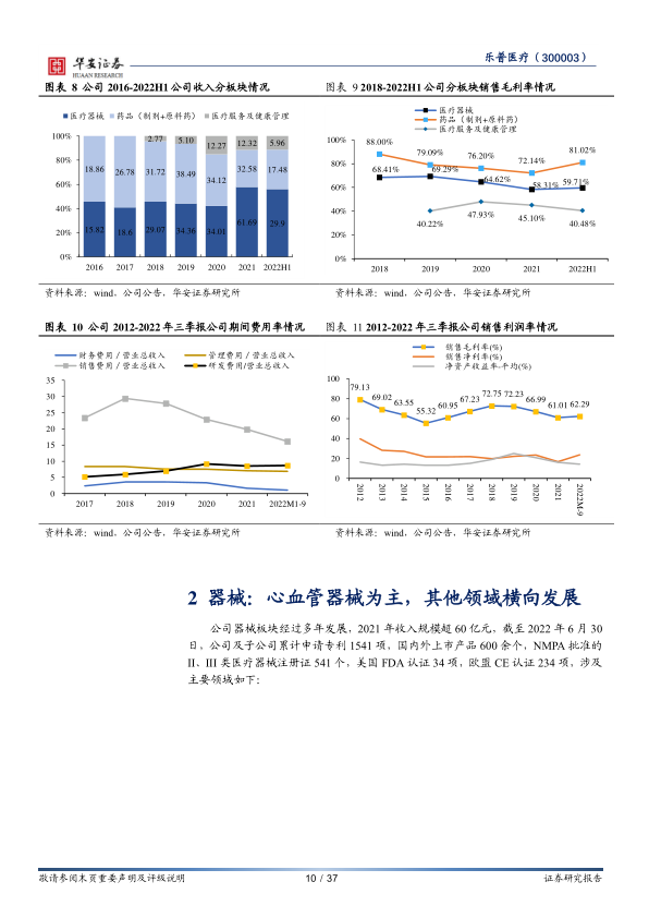在财务表现方面,公司过去十年(2012-2021年)收入从10.16亿元增长至106.60亿元,复合年增长率(CAGR)约29.85%;归母净利润从4.03亿元增长至17.19亿元,CAGR约17.49%。尽管面临集采和疫情扰动,公司整体收入和利润仍实现了稳健增长。2022年上半年,器械板块收入29.90亿元(占比56.05%),药品收入17.48亿元(占比32.77%),医疗服务及健康管理收入5.96亿元(占比11.17%)。公司销售毛利率多数年份保持在60%以上,2022年三季报销售净利率达到23.66%,显示出良好的盈利能力。