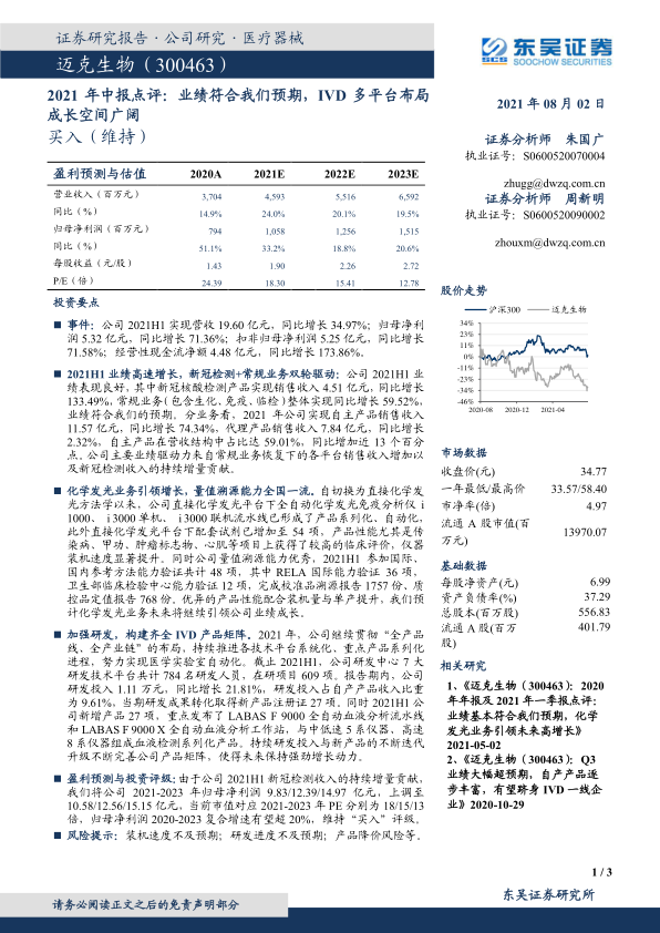 本报告对迈克生物2021年上半年的业绩进行了详细分析,认为公司业绩增长主要受益于新冠检测产品和常规业务的复苏,自主产品占比提升。化学发光业务凭借其产品优势和溯源能力,引领公司业绩增长。公司持续加强研发投入,不断完善产品矩阵,为未来增长提供动力。基于此,东吴证券维持对迈克生物的“买入”评级,并上调了其未来几年的盈利预测。