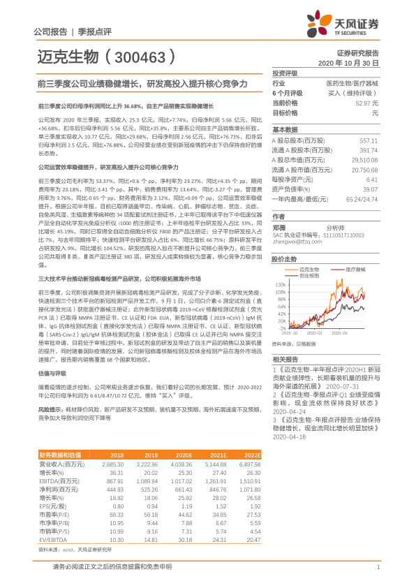 本报告分析了迈克生物(300463)2020年前三季度的业绩表现,并维持“买入”评级。核心观点如下: