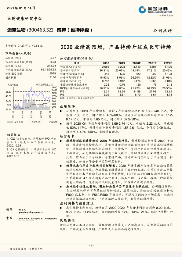 本报告分析了迈克生物(300463.SZ)2020年业绩高预增的原因,主要得益于新冠检测试剂的放量以及化学发光等板块的增长。同时,公司在渠道建设和产品升级方面取得进展,为未来可持续增长奠定基础。