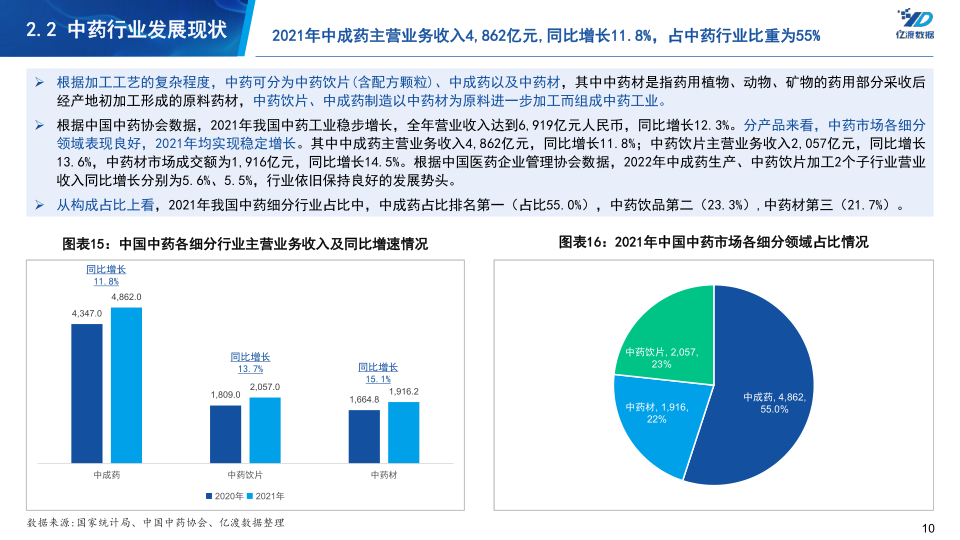 2021年中成药主营业务收入4,862亿元,同比增长11.8%,占中药行业比重为55%。中药材种植面积稳定,产量小幅回升,中成药生产企业出厂价格小幅上涨。