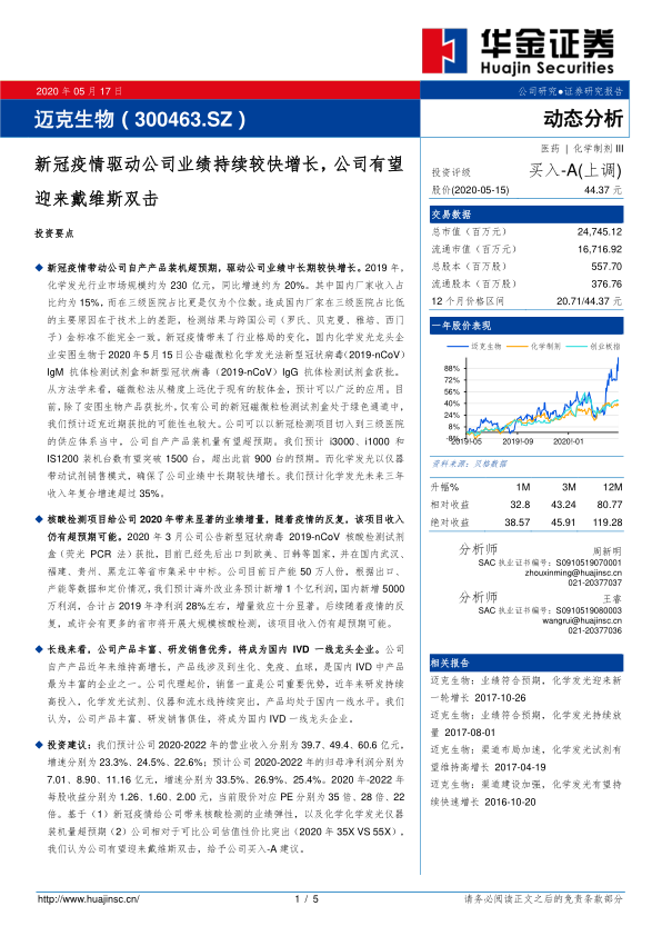 迈克生物在新冠疫情的催化下,其化学发光和核酸检测业务均展现出强劲的增长势头。公司凭借新冠检测项目成功拓展三级医院市场,并有望通过“仪器带动试剂”模式实现化学发光业务的持续高增长。核酸检测业务在2020年为公司带来了显著的业绩增量,且未来仍有超预期可能。长期来看,迈克生物凭借其丰富的产品线、卓越的研发和销售能力,有望巩固其在国内IVD领域的领先地位。综合考虑疫情带来的业绩弹性、公司的战略布局以及估值优势,报告维持“买入-A”的投资评级,预计公司将迎来戴维斯双击。