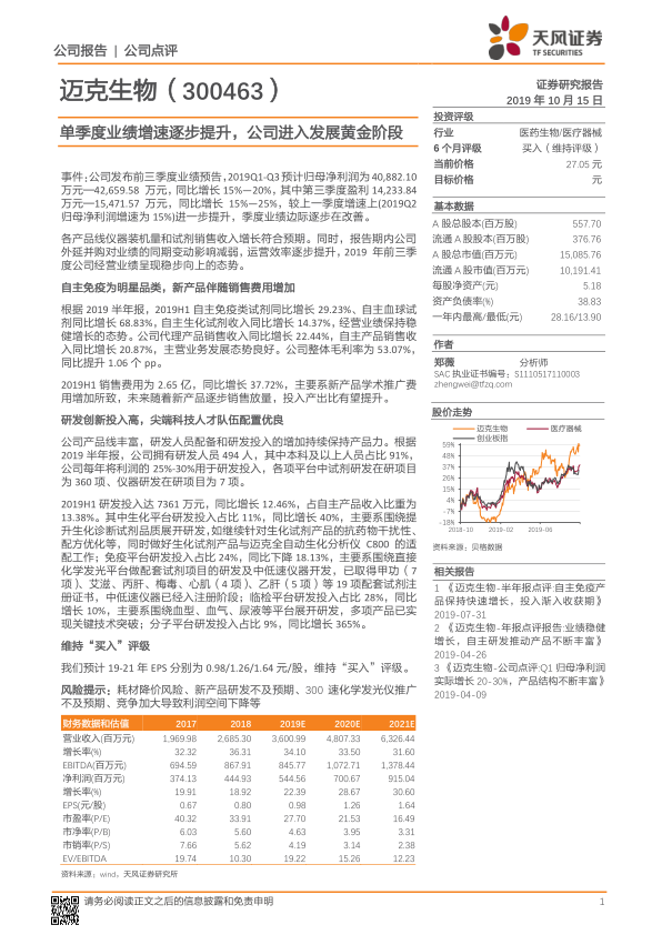 基于公司稳健的业绩增长和强大的研发实力,天风证券维持迈克生物“买入”评级。预计公司2019-2021年每股收益(EPS)分别为0.98元、1.26元和1.64元。