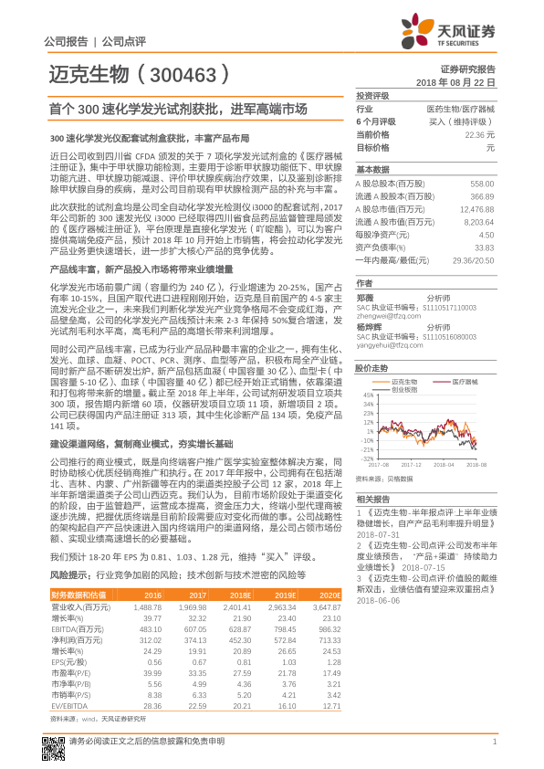 迈克生物凭借其新获批的300速化学发光试剂盒,有望在高端免疫市场占据一席之地。公司丰富的产品线和全产业链布局,以及积极的渠道建设,将为其未来的业绩增长提供坚实的基础。预计未来几年,迈克生物将保持快速增长的势头,建议维持“买入”评级。