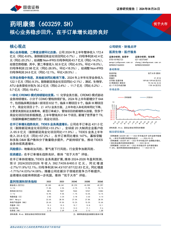 本报告分析了药明康德2024年上半年的财务数据和业务进展,指出公司核心业务稳健,二季度业绩环比改善。一体化CRDMO模式持续驱动发展,尤其在化学业务方面。TIDES业务表现突出,实现高速增长。公司在手订单增长趋势良好,为未来业绩增长奠定基础。维持对公司“优于大市”的评级,并对未来收入和利润进行了预测,认为公司在新分子领域的竞争力不断提升,业绩增长动能将得到进一步巩固。