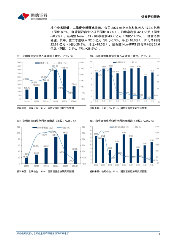 核心业务稳健,二季度业绩环比改善。公司2024年上半年整体收入172.4亿元(同比-8.6%,剔除新冠商业化项目同比-0.7%),归母净利润42.4亿元(同比-20.2%),经调整Non-IFRS归母净利润43.7亿元(同比-14.2%),经营态势稳健。其中,第二季度收入92.6亿元(同比-6.5%,环比+16.0%),归母净利润22.98亿元(同比-26.9%,环比+18.3%),经调整Non-IFRS归母净利润24.6亿元(同比-12.1%,环比+28.5%)。
