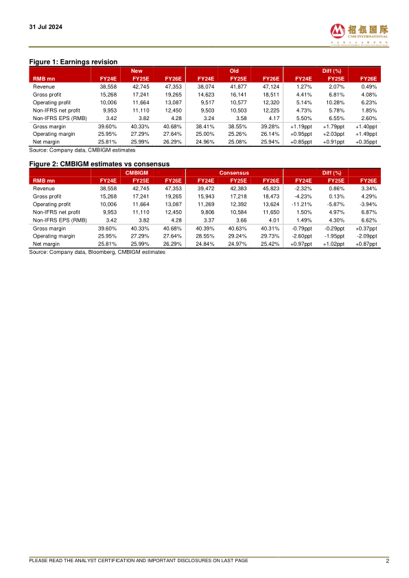Maintain BUY. Factoring in the positive trend of customer demand, we liftour TP from RMB53.23 to RMB54.27 (based on a 10-year DCF model withWACC of 10.38% and terminal growth of 2.0%). We forecast revenue togrow by -4.4%/ +10.9%/ +10.8% YoY and adjusted non-IFRS net income togrow by -8.3%/ +11.6%/ +12.1% YoY in 2024E/ 25E/ 26E, respectively