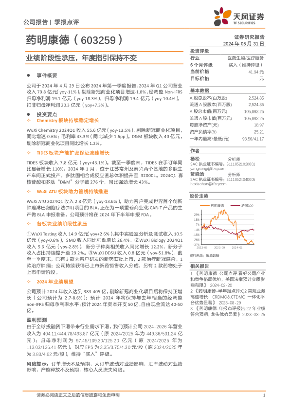 本报告对药明康德(603259)2024年第一季度业绩进行了分析,并维持“买入”评级。