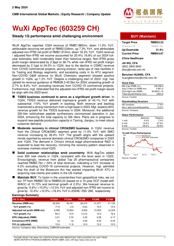 TIDES业务继续成为重要的增长驱动力。2024年第一季度,TIDES业务收入同比增长43.1%,未完成订单同比增长110%。收入和未完成订单均保持了2023年的强劲势头。管理层预计TIDES业务在2024年将实现60%的收入增长。此外,新增的22,000升固相肽合成器已于2024年1月投入运营,使总产能达到32,000升。目前正计划在江苏泰兴扩大新的肽生产能力,以满足强劲的客户需求。