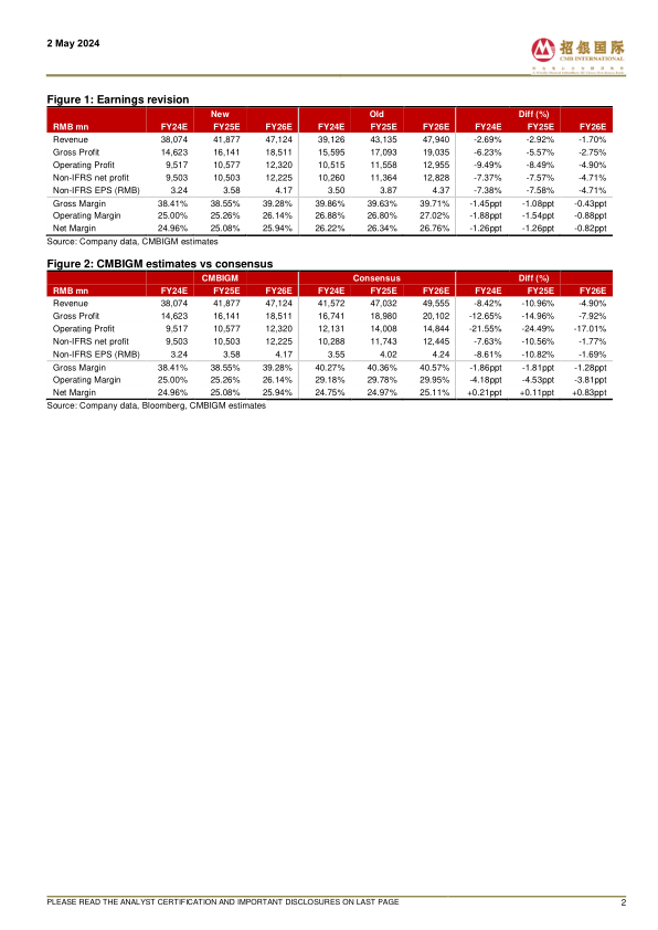 考虑到地缘政治风险带来的不确定性,我们将目标价从人民币67.53元下调至人民币53.23元(基于10年期DCF模型,WACC为10.73%,永续增长率为2.0%)。我们预测2024E/25E/26E的营收将分别同比下降5.6%/增长10.0%/增长12.5%,经调整的非IFRS净利润将分别同比下降12.4%/增长10.5%/增长16.4%。