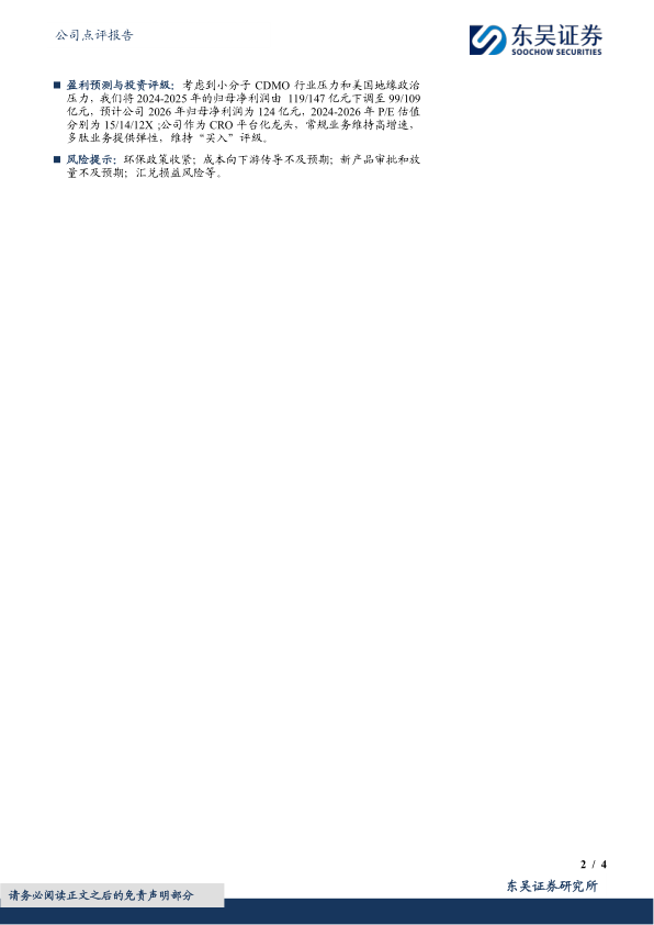 盈利预测与投资评级:考虑到小分子CDMO行业压力和美国地缘政治压力,我们将2024-2025年的归母净利润由119/147亿元下调至99/109亿元,预计公司2026年归母净利润为124亿元,2024-2026年P/E估值分别为15/14/12X;公司作为CRO平台化龙头,常规业务维持高增速,多肽业务提供弹性,维持“买入”评级。