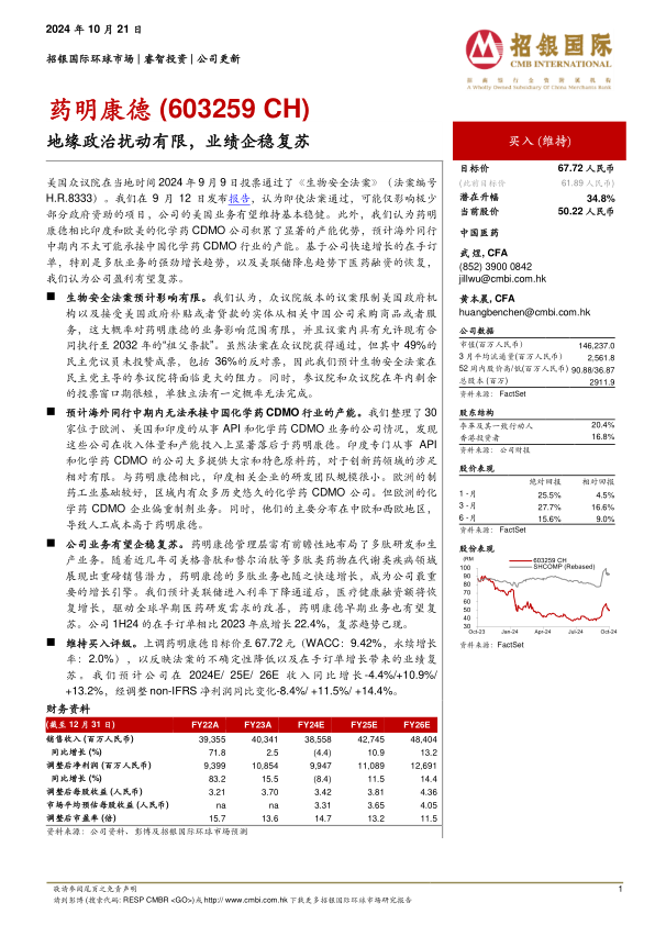 维持买入评级。上调药明康德目标价至67.72元(WACC:9.42%,永续增长率:2.0%),以反映法案的不确定性降低以及在手订单增长带来的业绩复苏。我们预计公司在2024E/25E/26E收入同比增长-4.4%/+10.9%/+13.2%,经调整non-IFRS净利润同比变化-8.4%/+11.5%/+14.4%。
