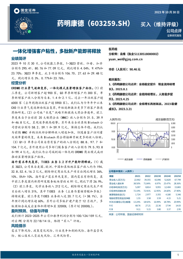 CRDMO行业景气逐渐复苏,一体化模式显著增强客户粘性。(1)前三季度,公司新增客户超900家,Q3单季新增客户约300家,单季新增客户收入分别为0.8、1.4和2.1亿。过去一年活跃客户超6000家(去年同期活跃客户超5900家)。我们认为今年年中以来CXO行业景气度逐渐由低谷复苏,开始逐渐激活更多下游客户推进药物研发。(2)公司施“长尾”战略不断提高大药企渗透率,前三季度来自于全球前20大制药企业(MNC)收入分别为31.5、39.9和46.8亿元,呈现逐季提高趋势。另外来自全球其他Biotech公司营收分别为58.2、59.1和59.9亿元,保持总体平稳。我们认为前期MNC并购活跃部分解释收入增速加快,但随着客户访问量及询单量的恢复,未来Biotech药企将接棒贡献更多的收入份额。(3)Q1-3单季公司来自原有客户的收入分别达88.8、97.7和104.7亿元,另外使用公司多部门服务客户收入分别为79.5、93.8和99.4亿元,我们认为公司端到端一体化的CRDMO商业模式成功推动显著增强客户粘性。