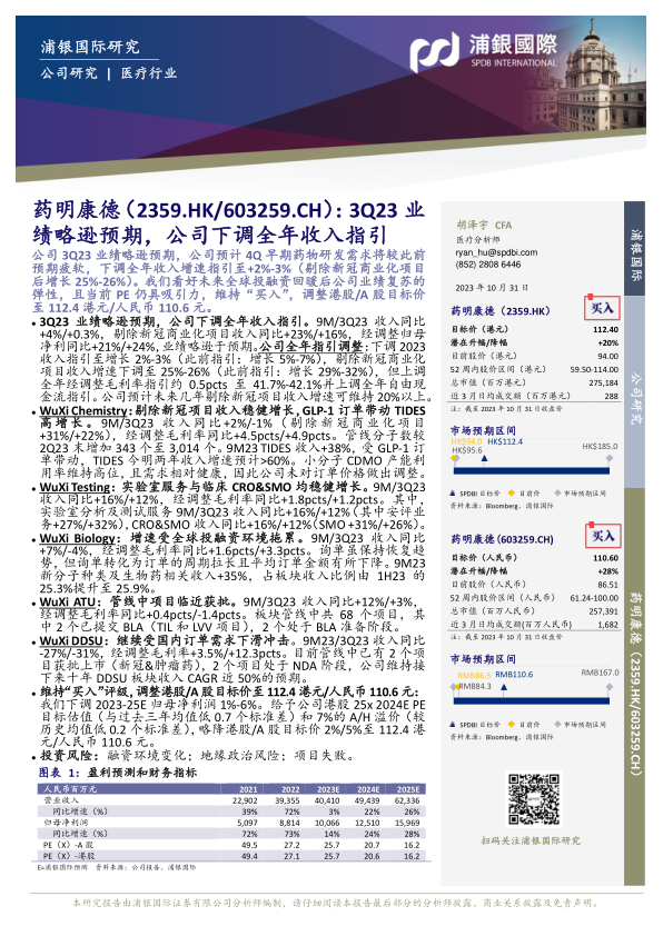 公司3Q23业绩略逊预期,公司预计4Q早期药物研发需求将较此前预期疲软,下调全年收入增速指引至+2%-3%(剔除新冠商业化项目后增长25%-26%)。我们看好未来全球投融资回暖后公司业绩复苏的弹性,且当前PE仍具吸引力,维持“买入”,调整港股/A股目标价至112.4港元/人民币110.6元。
