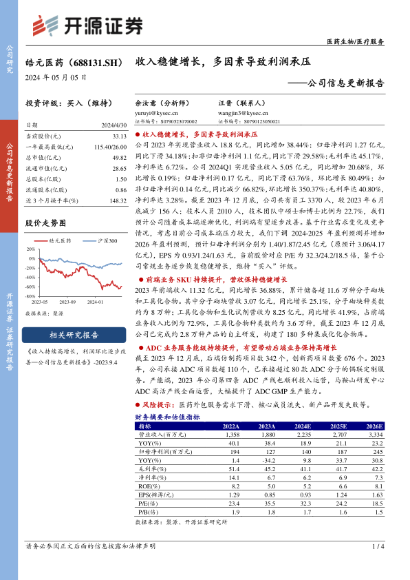 皓元医药在2023年及2024年第一季度展现出稳健的营收增长势头,但在多重因素影响下,利润端承受较大压力,毛利率和净利率有所下降。尽管如此,公司在前端业务通过持续提升SKU和自主研发能力,以及在后端ADC业务领域通过承接大量项目和扩充产能,展现出强劲的业务发展潜力。分析师基于当前市场环境和公司成本压力,对未来盈利预测进行了调整,但仍维持“买入”评级,表明对公司长期发展前景持乐观态度,尤其是在成本优化和常规业务恢复增长后,利润有望逐步改善。公司需关注医药外包服务需求、核心成员稳定性和新产品开发成功率等风险因素。